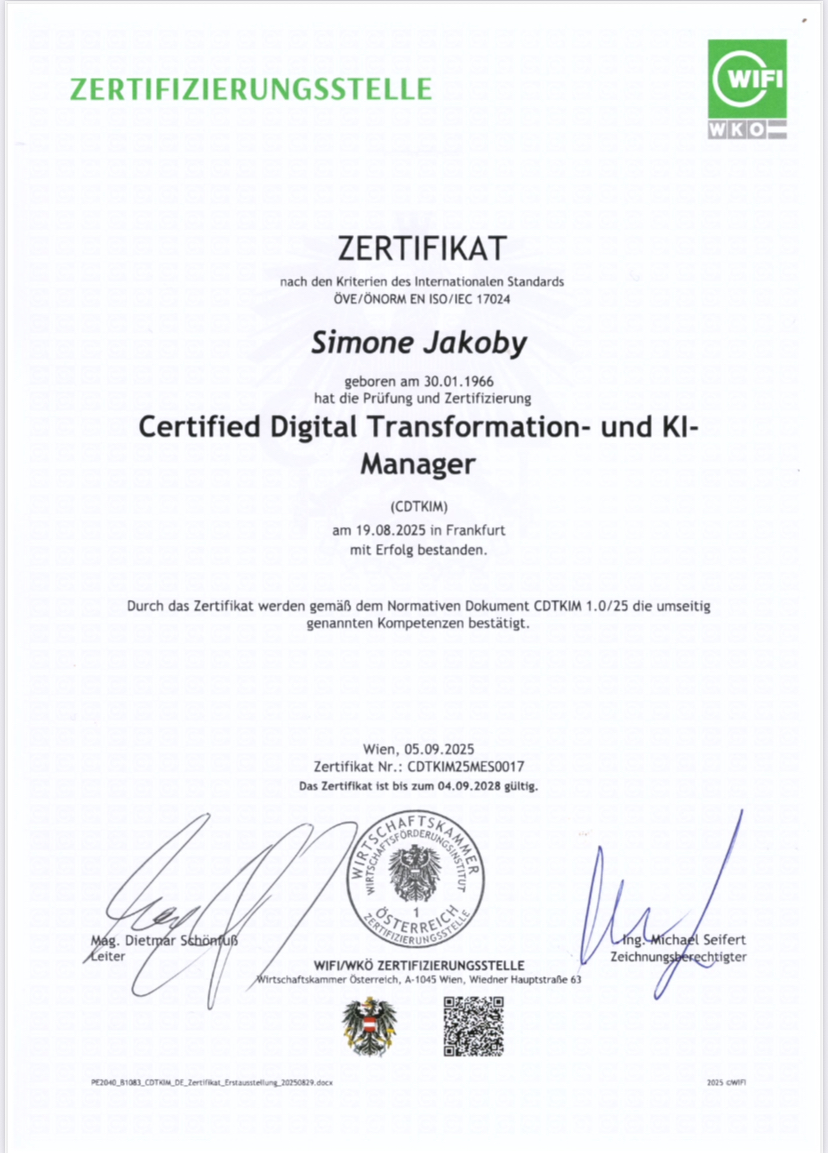 „Certified Digital Transformation & KI-Managerin“ – Ich freue mich riesig und bin stolz darauf, mich nun offiziell so nennen zu dürfen!